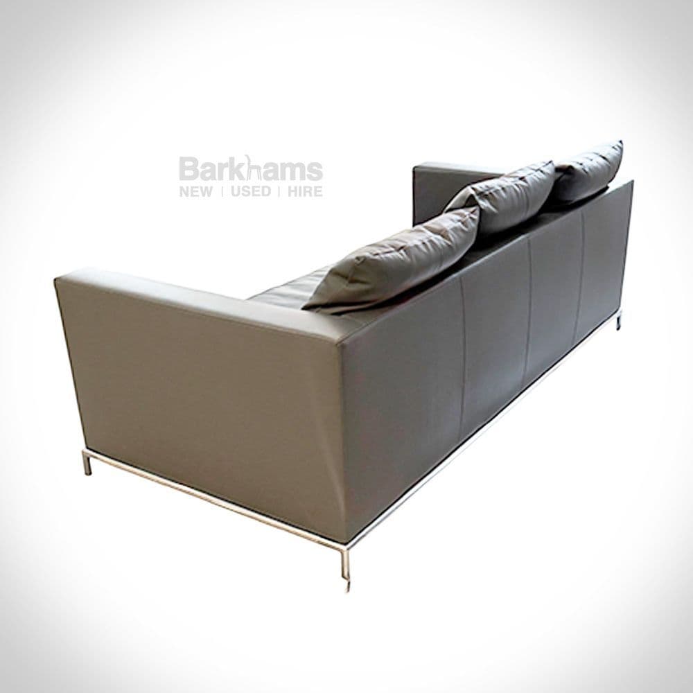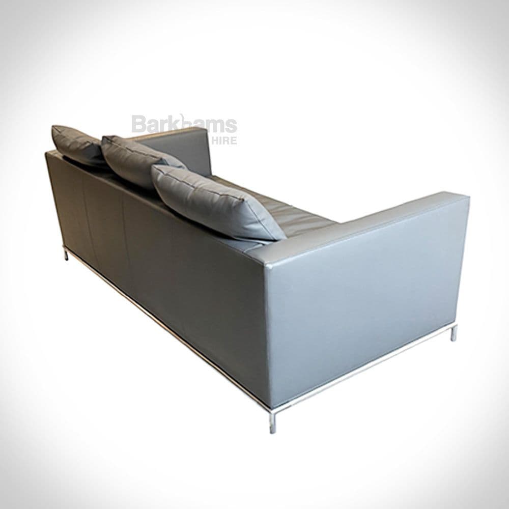 Three-Seater George Sofa upholstered in a premium Italian Grey Leather, supported by a tubular steel leg frame. The sofa has a single seat cushion and three back cushions, all featuring a cross-over stitch detail.