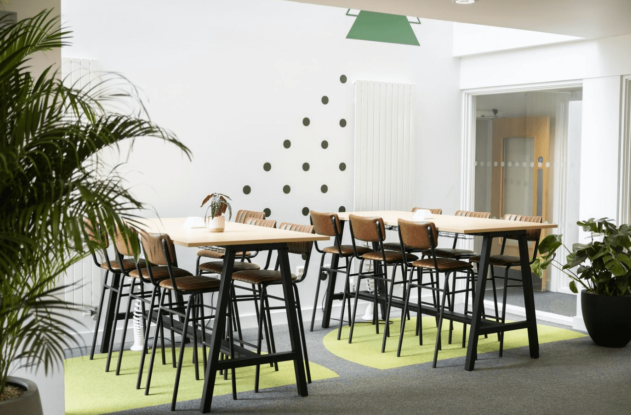 The Cafe: Barkhams offered a blended approach of new and refurbished furniture to renew the café area; pre-loved Connection Retro Chairs and refurbished Holmris Cabale dining tables, all in a matching Oak finish. The existing bar stools were re-upholstered in a brand colour-coded fabric from Camira, our sustainable fabric partner. New poseur tables were chosen from Hawk Furniture to create dynamic levels of seating, increasing the efficiency of the space and allowing natural light to illuminate the area.