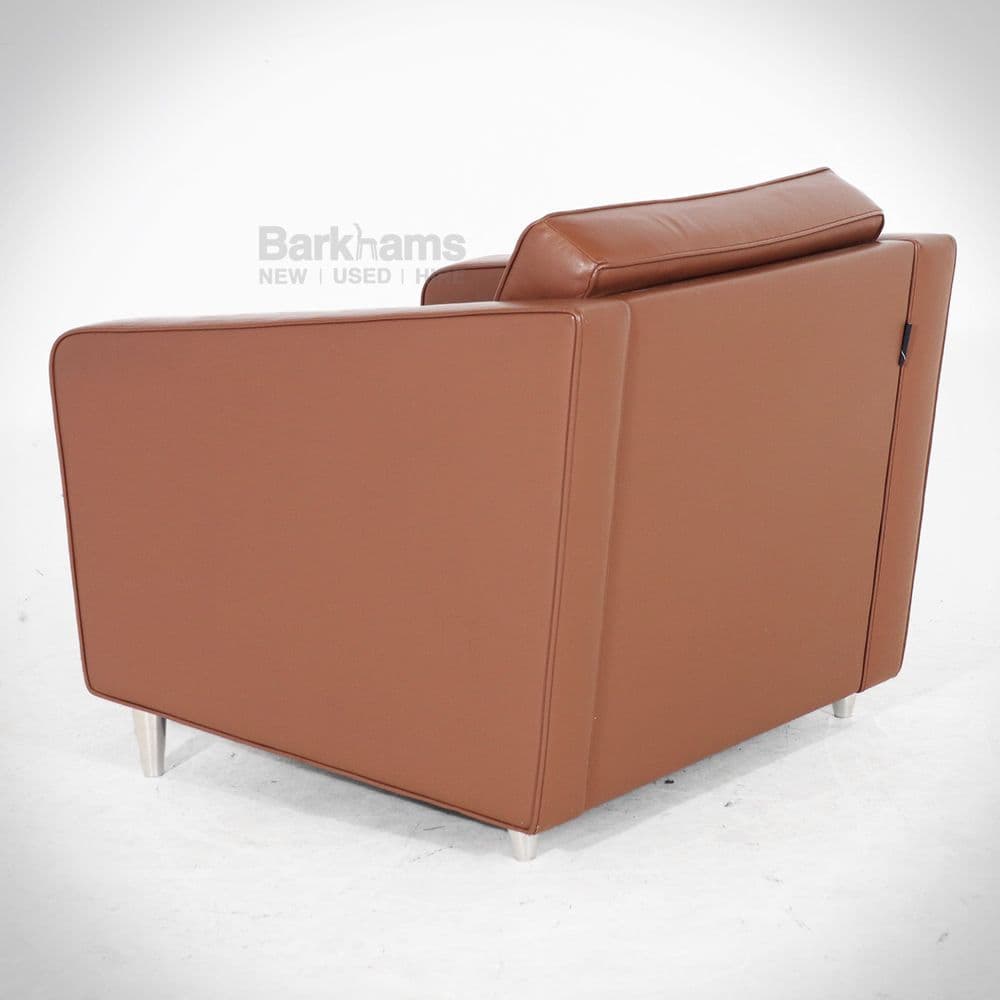 Upholstered in a premium brown or cream leather, featuring piped detailing around the edges of the armchair and tuffed square detailing on the cushions.