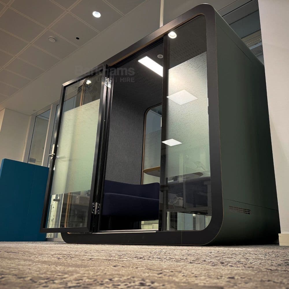 Refurbished Framery Q Meeting Maggie Four Person Office Pod. Used Acoustic Office Pod by Framery. Second Hand Meeting Pod - Framery Q Meeting Maggie is equipped with integrated lighting and bench seating.