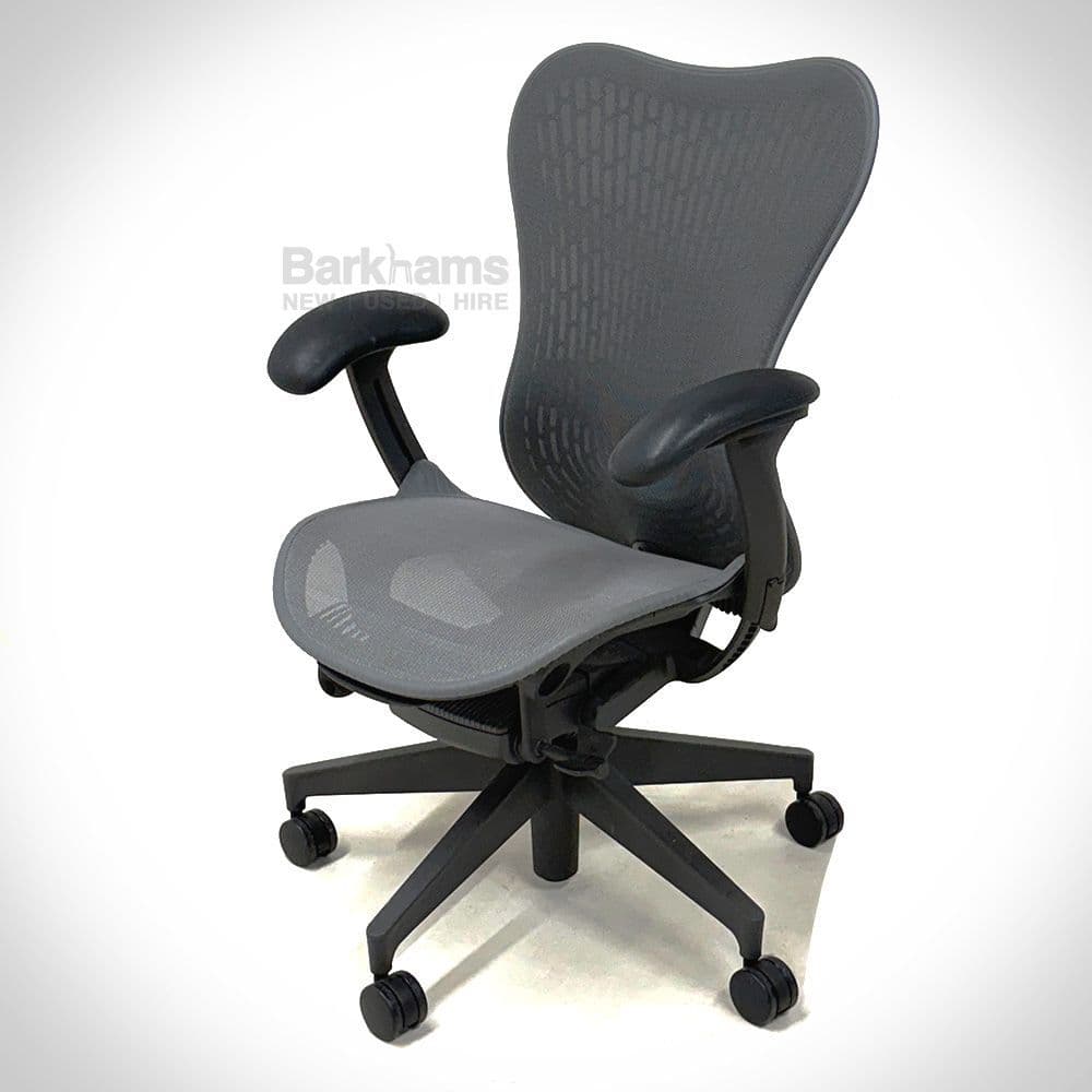 Refurbished Herman Miller Mirra 2 Chair Butterfly Mesh in Slate Grey. The Herman Miller Mirra 2 with a TriFlex back builds on the design themes of the original Mirra chair, whilst upgrading the ergonomics and comfort with an integrated Butterfly mesh.