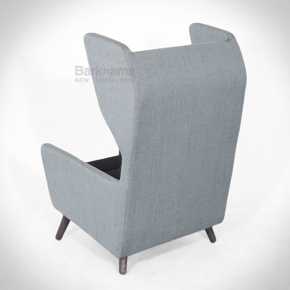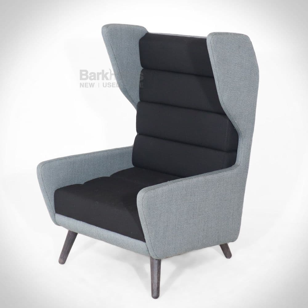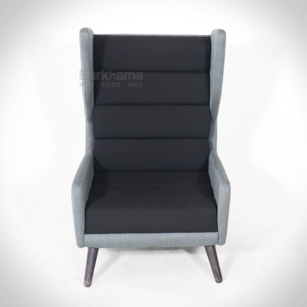Upholstered in two tone grey and black fabric with a wingback design to increase privacy and acoustics. Featuring two toned upholstered fabric a strong sub frame for support and a black wooden leg frame for a unique and modern design.